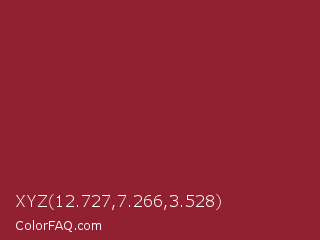XYZ 12.727,7.266,3.528 Color is a normal red color and the nearest color is Vivid Auburn #922724. Hex code #912030 and RGB value is rgb(145,32,48). In RGB color space, this color is composed of 57% red, 13% green, 19% blue, In CMYK color space, this color is composed of 0% cyan, 78% magenta, 67% yellow , 43% black , In HSL color space, this color has a hue angle of 352° , 64% saturation and 35% lightness.