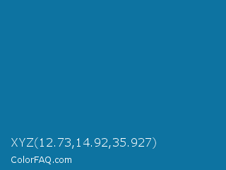XYZ 12.73,14.92,35.927 Color is a normal blue color and the nearest color is Allports #0076a3. Hex code #0d73a1 and RGB value is rgb(13,115,161). In RGB color space, this color is composed of 5% red, 45% green, 63% blue, In CMYK color space, this color is composed of 92% cyan, 29% magenta, 0% yellow , 37% black , In HSL color space, this color has a hue angle of 199° , 85% saturation and 34% lightness.