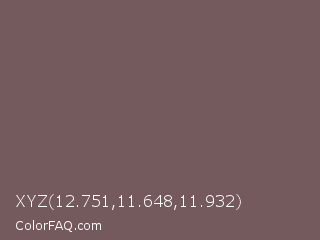 XYZ 12.751,11.648,11.932 Color is a normal red color and the nearest color is Russett #755a57. Hex code #74595d and RGB value is rgb(116,89,93). In RGB color space, this color is composed of 45% red, 35% green, 36% blue, In CMYK color space, this color is composed of 0% cyan, 23% magenta, 20% yellow , 55% black , In HSL color space, this color has a hue angle of 351° , 13% saturation and 40% lightness.