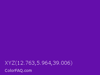 XYZ 12.763,5.964,39.006 Color is a normal purple color and the nearest color is Purple #660099. Hex code #640eab and RGB value is rgb(100,14,171). In RGB color space, this color is composed of 39% red, 5% green, 67% blue, In CMYK color space, this color is composed of 42% cyan, 92% magenta, 0% yellow , 33% black , In HSL color space, this color has a hue angle of 273° , 85% saturation and 36% lightness.