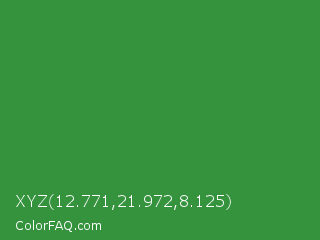 XYZ 12.771,21.972,8.125 Color is a normal green color and the nearest color is May Green #4c9141. Hex code #35933e and RGB value is rgb(53,147,62). In RGB color space, this color is composed of 21% red, 58% green, 24% blue, In CMYK color space, this color is composed of 64% cyan, 0% magenta, 58% yellow , 42% black , In HSL color space, this color has a hue angle of 126° , 47% saturation and 39% lightness.