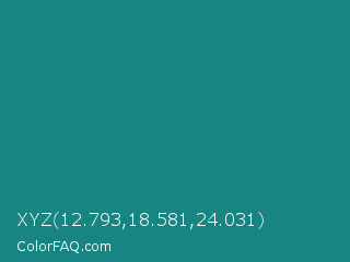 XYZ 12.793,18.581,24.031 Color is a normal cyan color and the nearest color is Elm #1c7c7d. Hex code #188582 and RGB value is rgb(24,133,130). In RGB color space, this color is composed of 9% red, 52% green, 51% blue, In CMYK color space, this color is composed of 82% cyan, 0% magenta, 2% yellow , 48% black , In HSL color space, this color has a hue angle of 178° , 69% saturation and 31% lightness.