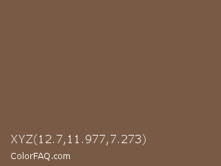 XYZ 12.7,11.977,7.273 Color is a normal orange color and the nearest color is Roman Coffee #795d4c. Hex code #795b45 and RGB value is rgb(121,91,69). In RGB color space, this color is composed of 47% red, 36% green, 27% blue, In CMYK color space, this color is composed of 0% cyan, 25% magenta, 43% yellow , 53% black , In HSL color space, this color has a hue angle of 25° , 27% saturation and 37% lightness.