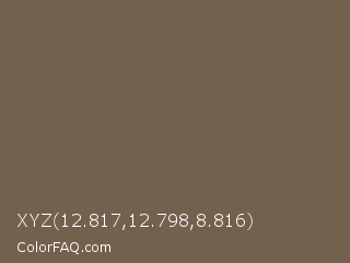XYZ 12.817,12.798,8.816 Color is a normal orange color and the nearest color is Roman Coffee #795d4c. Hex code #74614d and RGB value is rgb(116,97,77). In RGB color space, this color is composed of 45% red, 38% green, 30% blue, In CMYK color space, this color is composed of 0% cyan, 16% magenta, 34% yellow , 55% black , In HSL color space, this color has a hue angle of 31° , 20% saturation and 38% lightness.