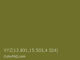 XYZ 12.831,15.503,4.324 Color is a dark yellow color and the nearest color is Crete #737829. Hex code #6e7228 and RGB value is rgb(110,114,40). In RGB color space, this color is composed of 43% red, 45% green, 16% blue, In CMYK color space, this color is composed of 4% cyan, 0% magenta, 65% yellow , 55% black , In HSL color space, this color has a hue angle of 63° , 48% saturation and 30% lightness.