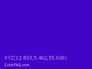 XYZ 12.833,5.462,55.636 Color is a normal indigo color and the nearest color is Interdimensional Blue #360ccc. Hex code #4204c9 and RGB value is rgb(66,4,201). In RGB color space, this color is composed of 26% red, 2% green, 79% blue, In CMYK color space, this color is composed of 67% cyan, 98% magenta, 0% yellow , 21% black , In HSL color space, this color has a hue angle of 259° , 96% saturation and 40% lightness.