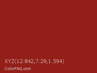 XYZ 12.842,7.29,1.594 Color is a normal red color and the nearest color is Old Brick #901e1e. Hex code #941e18 and RGB value is rgb(148,30,24). In RGB color space, this color is composed of 58% red, 12% green, 9% blue, In CMYK color space, this color is composed of 0% cyan, 80% magenta, 84% yellow , 42% black , In HSL color space, this color has a hue angle of 3° , 72% saturation and 34% lightness.