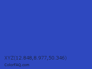 XYZ 12.848,8.977,50.346 Color is a normal blue color and the nearest color is Cerulean Blue #2a52be. Hex code #2e48bf and RGB value is rgb(46,72,191). In RGB color space, this color is composed of 18% red, 28% green, 75% blue, In CMYK color space, this color is composed of 76% cyan, 62% magenta, 0% yellow , 25% black , In HSL color space, this color has a hue angle of 229° , 61% saturation and 46% lightness.