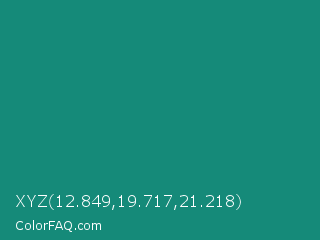 XYZ 12.849,19.717,21.218 Color is a normal cyan color and the nearest color is Elm #1c7c7d. Hex code #158a79 and RGB value is rgb(21,138,121). In RGB color space, this color is composed of 8% red, 54% green, 47% blue, In CMYK color space, this color is composed of 85% cyan, 0% magenta, 12% yellow , 46% black , In HSL color space, this color has a hue angle of 171° , 74% saturation and 31% lightness.