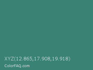 XYZ 12.865,17.908,19.918 Color is a normal cyan color and the nearest color is Viridian #40826d. Hex code #3a8176 and RGB value is rgb(58,129,118). In RGB color space, this color is composed of 23% red, 51% green, 46% blue, In CMYK color space, this color is composed of 55% cyan, 0% magenta, 9% yellow , 49% black , In HSL color space, this color has a hue angle of 171° , 38% saturation and 37% lightness.
