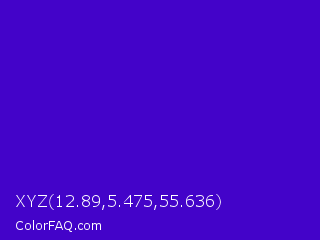 XYZ 12.89,5.475,55.636 Color is a normal indigo color and the nearest color is Interdimensional Blue #360ccc. Hex code #4303c9 and RGB value is rgb(67,3,201). In RGB color space, this color is composed of 26% red, 1% green, 79% blue, In CMYK color space, this color is composed of 67% cyan, 99% magenta, 0% yellow , 21% black , In HSL color space, this color has a hue angle of 259° , 97% saturation and 40% lightness.