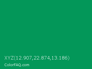 XYZ 12.907,22.874,13.186 Color is a dark green color and the nearest color is Shamrock Green #009e60. Hex code #039759 and RGB value is rgb(3,151,89). In RGB color space, this color is composed of 1% red, 59% green, 35% blue, In CMYK color space, this color is composed of 98% cyan, 0% magenta, 41% yellow , 41% black , In HSL color space, this color has a hue angle of 155° , 96% saturation and 30% lightness.