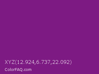 XYZ 12.924,6.737,22.092 Color is a normal magenta color and the nearest color is Seance #731e8f. Hex code #7d1a83 and RGB value is rgb(125,26,131). In RGB color space, this color is composed of 49% red, 10% green, 51% blue, In CMYK color space, this color is composed of 5% cyan, 80% magenta, 0% yellow , 49% black , In HSL color space, this color has a hue angle of 297° , 67% saturation and 31% lightness.