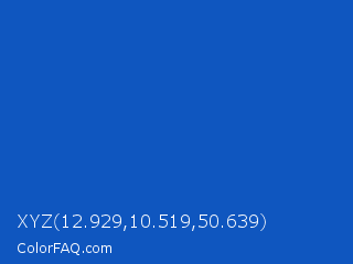 XYZ 12.929,10.519,50.639 Color is a normal blue color and the nearest color is Sapphire #0f52ba. Hex code #0f56bf and RGB value is rgb(15,86,191). In RGB color space, this color is composed of 6% red, 34% green, 75% blue, In CMYK color space, this color is composed of 92% cyan, 55% magenta, 0% yellow , 25% black , In HSL color space, this color has a hue angle of 216° , 85% saturation and 40% lightness.