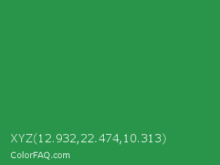 XYZ 12.932,22.474,10.313 Color is a normal green color and the nearest color is Sea Green #2e8b57. Hex code #29954b and RGB value is rgb(41,149,75). In RGB color space, this color is composed of 16% red, 58% green, 29% blue, In CMYK color space, this color is composed of 72% cyan, 0% magenta, 50% yellow , 42% black , In HSL color space, this color has a hue angle of 139° , 57% saturation and 37% lightness.