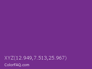 XYZ 12.949,7.513,25.967 Color is a normal purple color and the nearest color is Eminence #6c3082. Hex code #742d8d and RGB value is rgb(116,45,141). In RGB color space, this color is composed of 45% red, 18% green, 55% blue, In CMYK color space, this color is composed of 18% cyan, 68% magenta, 0% yellow , 45% black , In HSL color space, this color has a hue angle of 284° , 52% saturation and 36% lightness.