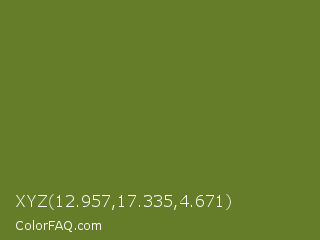 XYZ 12.957,17.335,4.671 Color is a normal lime color and the nearest color is Fern Frond #657220. Hex code #657c28 and RGB value is rgb(101,124,40). In RGB color space, this color is composed of 40% red, 49% green, 16% blue, In CMYK color space, this color is composed of 19% cyan, 0% magenta, 68% yellow , 51% black , In HSL color space, this color has a hue angle of 76° , 51% saturation and 32% lightness.