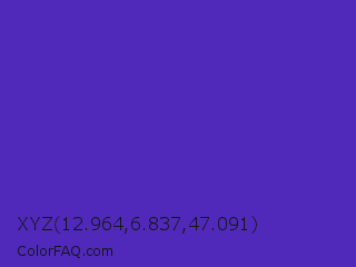 XYZ 12.964,6.837,47.091 Color is a normal indigo color and the nearest color is Purple Heart Crayola #652dc1. Hex code #5029ba and RGB value is rgb(80,41,186). In RGB color space, this color is composed of 31% red, 16% green, 73% blue, In CMYK color space, this color is composed of 57% cyan, 78% magenta, 0% yellow , 27% black , In HSL color space, this color has a hue angle of 256° , 64% saturation and 45% lightness.