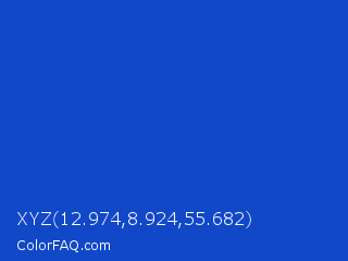 XYZ 12.974,8.924,55.682 Color is a normal blue color and the nearest color is Sapphire #0f52ba. Hex code #1148c8 and RGB value is rgb(17,72,200). In RGB color space, this color is composed of 7% red, 28% green, 78% blue, In CMYK color space, this color is composed of 92% cyan, 64% magenta, 0% yellow , 22% black , In HSL color space, this color has a hue angle of 222° , 84% saturation and 43% lightness.