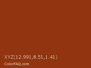 XYZ 12.991,8.51,1.41 Color is a normal orange color and the nearest color is Kobe #882d17. Hex code #91340f and RGB value is rgb(145,52,15). In RGB color space, this color is composed of 57% red, 20% green, 6% blue, In CMYK color space, this color is composed of 0% cyan, 64% magenta, 90% yellow , 43% black , In HSL color space, this color has a hue angle of 17° , 81% saturation and 31% lightness.