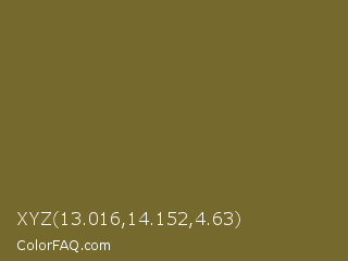 XYZ 13.016,14.152,4.63 Color is a normal yellow color and the nearest color is Yellow Metal #716338. Hex code #76692e and RGB value is rgb(118,105,46). In RGB color space, this color is composed of 46% red, 41% green, 18% blue, In CMYK color space, this color is composed of 0% cyan, 11% magenta, 61% yellow , 54% black , In HSL color space, this color has a hue angle of 49° , 44% saturation and 32% lightness.