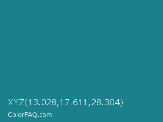 XYZ 13.028,17.611,28.304 Color is a normal cyan color and the nearest color is Metallic Seaweed #0a7e8c. Hex code #1a808e and RGB value is rgb(26,128,142). In RGB color space, this color is composed of 10% red, 50% green, 56% blue, In CMYK color space, this color is composed of 82% cyan, 10% magenta, 0% yellow , 44% black , In HSL color space, this color has a hue angle of 187° , 69% saturation and 33% lightness.