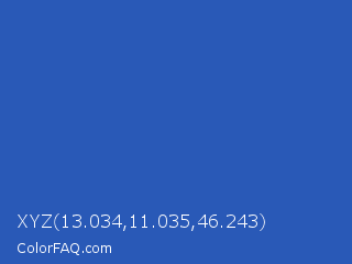 XYZ 13.034,11.035,46.243 Color is a normal blue color and the nearest color is Cerulean Blue #2a52be. Hex code #2959b7 and RGB value is rgb(41,89,183). In RGB color space, this color is composed of 16% red, 35% green, 72% blue, In CMYK color space, this color is composed of 78% cyan, 51% magenta, 0% yellow , 28% black , In HSL color space, this color has a hue angle of 220° , 63% saturation and 44% lightness.