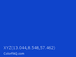 XYZ 13.044,8.548,57.462 Color is a normal blue color and the nearest color is New Car #214fc6. Hex code #0f44cb and RGB value is rgb(15,68,203). In RGB color space, this color is composed of 6% red, 27% green, 80% blue, In CMYK color space, this color is composed of 93% cyan, 67% magenta, 0% yellow , 20% black , In HSL color space, this color has a hue angle of 223° , 86% saturation and 43% lightness.