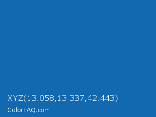 XYZ 13.058,13.337,42.443 Color is a normal blue color and the nearest color is Green Blue #1164b4. Hex code #1369af and RGB value is rgb(19,105,175). In RGB color space, this color is composed of 7% red, 41% green, 69% blue, In CMYK color space, this color is composed of 89% cyan, 40% magenta, 0% yellow , 31% black , In HSL color space, this color has a hue angle of 207° , 80% saturation and 38% lightness.