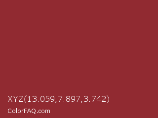 XYZ 13.059,7.897,3.742 Color is a normal red color and the nearest color is Japanese Carmine #9d2933. Hex code #912a31 and RGB value is rgb(145,42,49). In RGB color space, this color is composed of 57% red, 16% green, 19% blue, In CMYK color space, this color is composed of 0% cyan, 71% magenta, 66% yellow , 43% black , In HSL color space, this color has a hue angle of 356° , 55% saturation and 37% lightness.