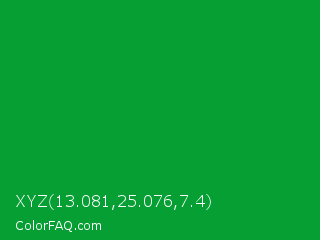 XYZ 13.081,25.076,7.4 Color is a normal green color and the nearest color is North Texas Green #059033. Hex code #059f34 and RGB value is rgb(5,159,52). In RGB color space, this color is composed of 2% red, 62% green, 20% blue, In CMYK color space, this color is composed of 97% cyan, 0% magenta, 67% yellow , 38% black , In HSL color space, this color has a hue angle of 138° , 94% saturation and 32% lightness.