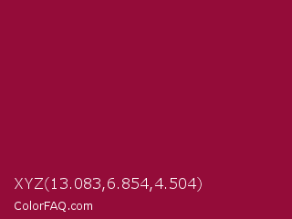 XYZ 13.083,6.854,4.504 Color is a normal rose color and the nearest color is Pink Raspberry #980036. Hex code #940c39 and RGB value is rgb(148,12,57). In RGB color space, this color is composed of 58% red, 5% green, 22% blue, In CMYK color space, this color is composed of 0% cyan, 92% magenta, 61% yellow , 42% black , In HSL color space, this color has a hue angle of 340° , 85% saturation and 31% lightness.