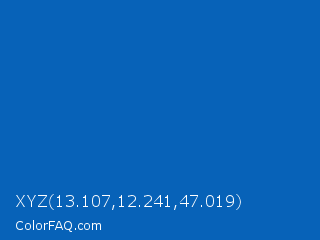 XYZ 13.107,12.241,47.019 Color is a normal blue color and the nearest color is Green Blue #1164b4. Hex code #0762b8 and RGB value is rgb(7,98,184). In RGB color space, this color is composed of 3% red, 38% green, 72% blue, In CMYK color space, this color is composed of 96% cyan, 47% magenta, 0% yellow , 28% black , In HSL color space, this color has a hue angle of 209° , 93% saturation and 37% lightness.