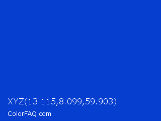 XYZ 13.115,8.099,59.903 Color is a normal blue color and the nearest color is Absolute Zero #0048ba. Hex code #063fcf and RGB value is rgb(6,63,207). In RGB color space, this color is composed of 2% red, 25% green, 81% blue, In CMYK color space, this color is composed of 97% cyan, 70% magenta, 0% yellow , 19% black , In HSL color space, this color has a hue angle of 223° , 94% saturation and 42% lightness.