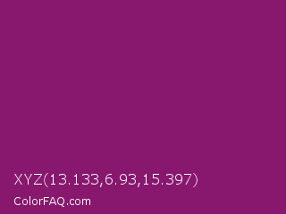 XYZ 13.133,6.93,15.397 Color is a normal magenta color and the nearest color is Cardinal Pink #8c055e. Hex code #87186e and RGB value is rgb(135,24,110). In RGB color space, this color is composed of 53% red, 9% green, 43% blue, In CMYK color space, this color is composed of 0% cyan, 82% magenta, 19% yellow , 47% black , In HSL color space, this color has a hue angle of 314° , 70% saturation and 31% lightness.