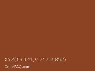 XYZ 13.141,9.717,2.852 Color is a normal orange color and the nearest color is Cumin #924321. Hex code #8c4324 and RGB value is rgb(140,67,36). In RGB color space, this color is composed of 55% red, 26% green, 14% blue, In CMYK color space, this color is composed of 0% cyan, 52% magenta, 74% yellow , 45% black , In HSL color space, this color has a hue angle of 18° , 59% saturation and 35% lightness.