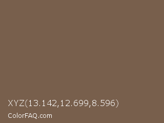 XYZ 13.142,12.699,8.596 Color is a normal orange color and the nearest color is Roman Coffee #795d4c. Hex code #785f4c and RGB value is rgb(120,95,76). In RGB color space, this color is composed of 47% red, 37% green, 30% blue, In CMYK color space, this color is composed of 0% cyan, 21% magenta, 37% yellow , 53% black , In HSL color space, this color has a hue angle of 26° , 22% saturation and 38% lightness.