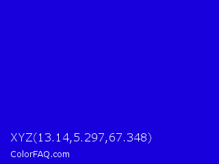 XYZ 13.14,5.297,67.348 Color is a normal indigo color and the nearest color is Medium Blue #0000cd. Hex code #1700db and RGB value is rgb(23,0,219). In RGB color space, this color is composed of 9% red, 0% green, 86% blue, In CMYK color space, this color is composed of 89% cyan, 100% magenta, 0% yellow , 14% black , In HSL color space, this color has a hue angle of 246° , 100% saturation and 43% lightness.