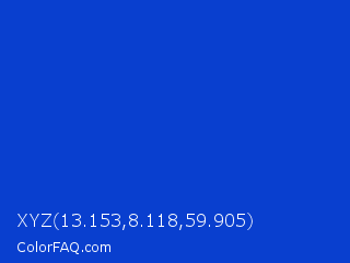 XYZ 13.153,8.118,59.905 Color is a normal blue color and the nearest color is Absolute Zero #0048ba. Hex code #093fcf and RGB value is rgb(9,63,207). In RGB color space, this color is composed of 4% red, 25% green, 81% blue, In CMYK color space, this color is composed of 96% cyan, 70% magenta, 0% yellow , 19% black , In HSL color space, this color has a hue angle of 224° , 92% saturation and 42% lightness.