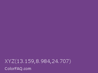XYZ 13.159,8.984,24.707 Color is a normal purple color and the nearest color is Affair #714693. Hex code #714089 and RGB value is rgb(113,64,137). In RGB color space, this color is composed of 44% red, 25% green, 54% blue, In CMYK color space, this color is composed of 18% cyan, 53% magenta, 0% yellow , 46% black , In HSL color space, this color has a hue angle of 280° , 36% saturation and 39% lightness.
