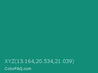 XYZ 13.164,20.534,21.039 Color is a normal cyan color and the nearest color is Elf Green #088370. Hex code #128d78 and RGB value is rgb(18,141,120). In RGB color space, this color is composed of 7% red, 55% green, 47% blue, In CMYK color space, this color is composed of 87% cyan, 0% magenta, 15% yellow , 45% black , In HSL color space, this color has a hue angle of 170° , 77% saturation and 31% lightness.
