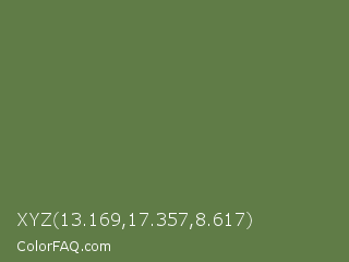 XYZ 13.169,17.357,8.617 Color is a normal green color and the nearest color is Dingley #5d7747. Hex code #607c47 and RGB value is rgb(96,124,71). In RGB color space, this color is composed of 38% red, 49% green, 28% blue, In CMYK color space, this color is composed of 23% cyan, 0% magenta, 43% yellow , 51% black , In HSL color space, this color has a hue angle of 92° , 27% saturation and 38% lightness.