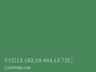 XYZ 13.182,19.444,12.731 Color is a normal green color and the nearest color is Middle Green #4d8c57. Hex code #48875a and RGB value is rgb(72,135,90). In RGB color space, this color is composed of 28% red, 53% green, 35% blue, In CMYK color space, this color is composed of 47% cyan, 0% magenta, 33% yellow , 47% black , In HSL color space, this color has a hue angle of 137° , 30% saturation and 41% lightness.