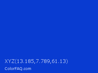 XYZ 13.185,7.789,61.13 Color is a normal blue color and the nearest color is Absolute Zero #0048ba. Hex code #093bd1 and RGB value is rgb(9,59,209). In RGB color space, this color is composed of 4% red, 23% green, 82% blue, In CMYK color space, this color is composed of 96% cyan, 72% magenta, 0% yellow , 18% black , In HSL color space, this color has a hue angle of 225° , 92% saturation and 43% lightness.