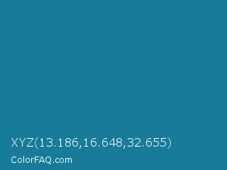 XYZ 13.186,16.648,32.655 Color is a normal blue color and the nearest color is Jelly Bean #297b9a. Hex code #177b99 and RGB value is rgb(23,123,153). In RGB color space, this color is composed of 9% red, 48% green, 60% blue, In CMYK color space, this color is composed of 85% cyan, 20% magenta, 0% yellow , 40% black , In HSL color space, this color has a hue angle of 194° , 74% saturation and 35% lightness.