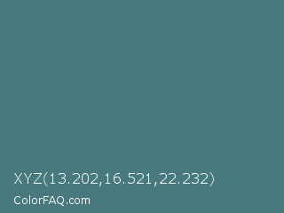 XYZ 13.202,16.521,22.232 Color is a normal cyan color and the nearest color is Faded Jade #427977. Hex code #47797e and RGB value is rgb(71,121,126). In RGB color space, this color is composed of 28% red, 47% green, 49% blue, In CMYK color space, this color is composed of 44% cyan, 4% magenta, 0% yellow , 51% black , In HSL color space, this color has a hue angle of 185° , 28% saturation and 39% lightness.