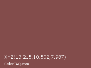 XYZ 13.215,10.502,7.987 Color is a normal red color and the nearest color is Tuscan Red #7c4848. Hex code #834c4b and RGB value is rgb(131,76,75). In RGB color space, this color is composed of 51% red, 30% green, 29% blue, In CMYK color space, this color is composed of 0% cyan, 42% magenta, 43% yellow , 49% black , In HSL color space, this color has a hue angle of 1° , 27% saturation and 40% lightness.