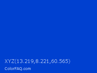 XYZ 13.219,8.221,60.565 Color is a normal blue color and the nearest color is Absolute Zero #0048ba. Hex code #0040d0 and RGB value is rgb(0,64,208). In RGB color space, this color is composed of 0% red, 25% green, 82% blue, In CMYK color space, this color is composed of 100% cyan, 69% magenta, 0% yellow , 18% black , In HSL color space, this color has a hue angle of 222° , 100% saturation and 41% lightness.