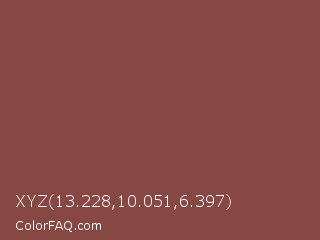 XYZ 13.228,10.051,6.397 Color is a normal red color and the nearest color is Ironstone #86483c. Hex code #874742 and RGB value is rgb(135,71,66). In RGB color space, this color is composed of 53% red, 28% green, 26% blue, In CMYK color space, this color is composed of 0% cyan, 47% magenta, 51% yellow , 47% black , In HSL color space, this color has a hue angle of 4° , 34% saturation and 39% lightness.