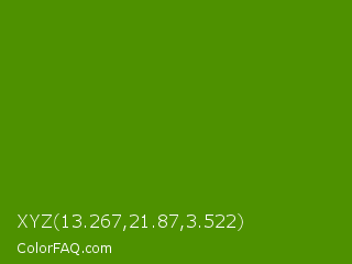 XYZ 13.267,21.87,3.522 Color is a dark green color and the nearest color is Avocado #568203. Hex code #4e9100 and RGB value is rgb(78,145,0). In RGB color space, this color is composed of 31% red, 57% green, 0% blue, In CMYK color space, this color is composed of 46% cyan, 0% magenta, 100% yellow , 43% black , In HSL color space, this color has a hue angle of 88° , 100% saturation and 28% lightness.
